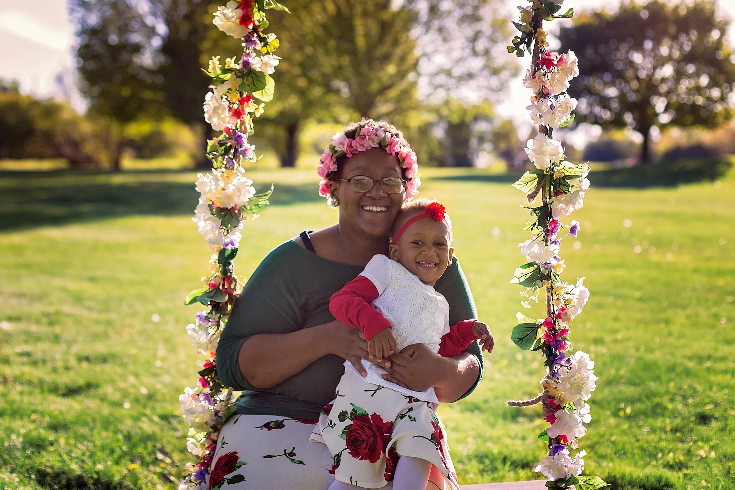 I am so excited to share these mini sessions with you! I love this setup, and am already looking forward to next year! Mom and me Mini Sessions featured a wooden tree swing wrapped in flowers and pink flower crowns for the mothers and daughters. I have my awesome assistant, Autumn, to thank for putting the flowers and flower crowns together for me! They turned out so beautifully! My husband help me put up the swing at the Afton Forest Preserve in Dekalb. Such a beautiful location! Yasmine and Ariella were my first clients and they rocked their session together! I have been photographing Ariella since she was four months old, and it is so great to see how much she's grown every time she comes back. Her and her mom looked so cute in their matching skirts!